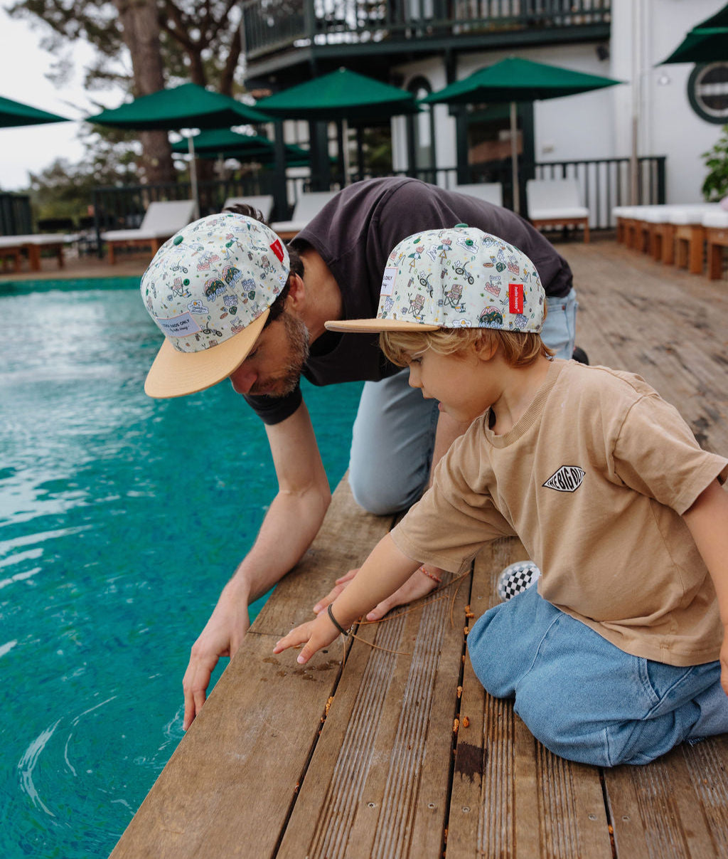 The Mountain Ride Cap for kids and babies goes with our children's water bottle and children's backpack of the same name. Flat brim cap, patterned cap, colorful cap. Sold in an adult size for matching father-son and father-daughter looks!