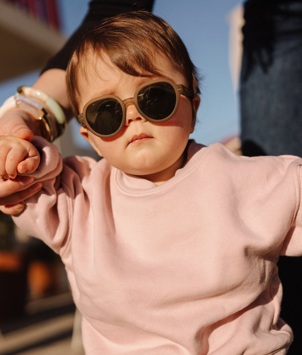 Craquez pour les Lunettes de soleil pour enfants et bébés, Megy Nate. Premium, unisexe, forme ronde, passe-partout. Lunettes fabriquées en polycarbonate recyclé, top qualité. Protection idéale : UV400, verres Cat. 3, conçues pour les Cool Kids, dès 9 mois.